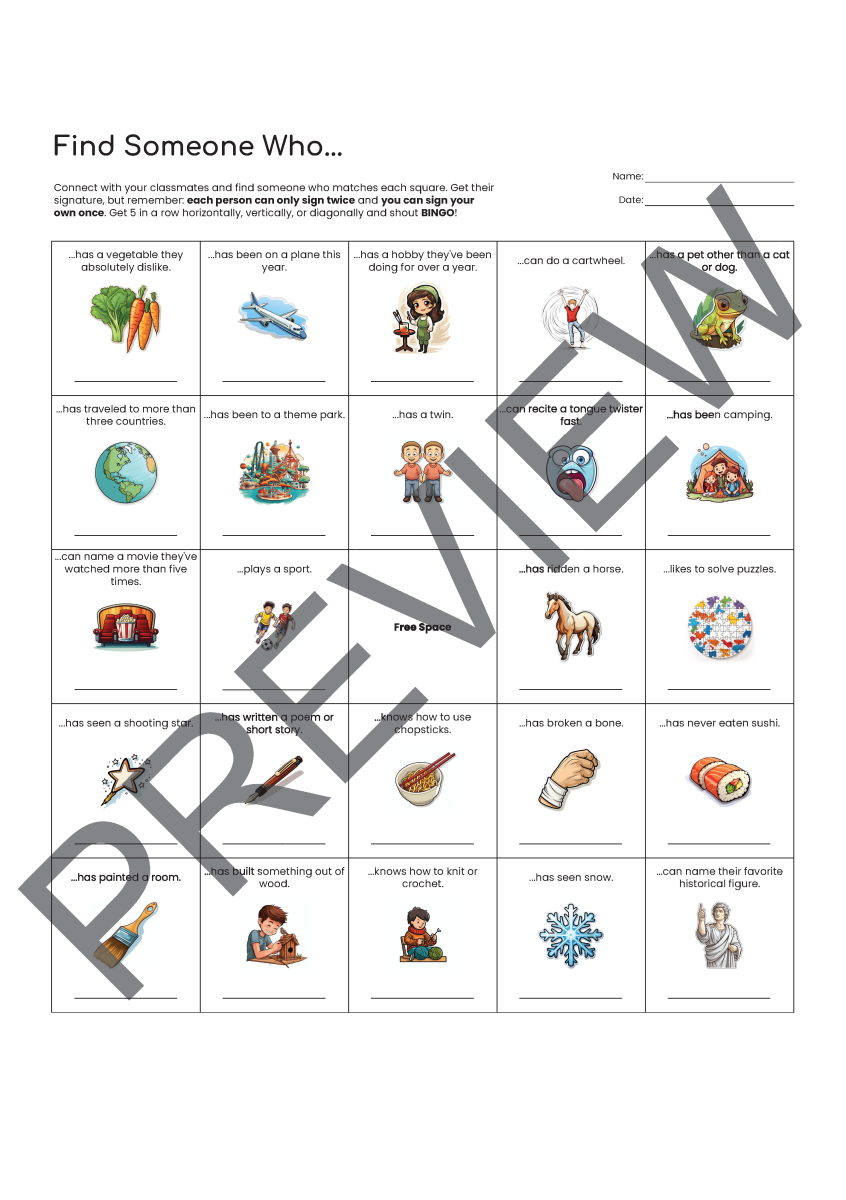 Why “Find Someone Who…”? This game is more than just bingo. It’s about building bridges between students, understanding diverse experiences, and creating a cohesive classroom community. Whether you’re starting a new school year, introducing new students, or simply looking for a fun-filled class activity, “Find Someone Who…” is your go-to choice.