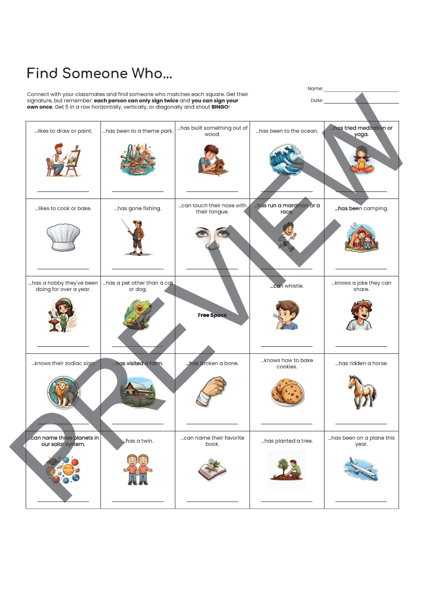 How to Play: Each gameboard boasts a 5×5 grid formation, with a ‘Free Space’ square in the center. Every square encompasses a description, an illustrative image, and space for a classmate’s signature. The goal? Connect with classmates, discover commonalities, and collect signatures. But here’s the twist: each student can only sign twice, and participants can sign their own board once. The race is on to achieve 5 signatures in a row, be it horizontally, vertically, or diagonally. The first one to do so gets to shout, “BINGO!”