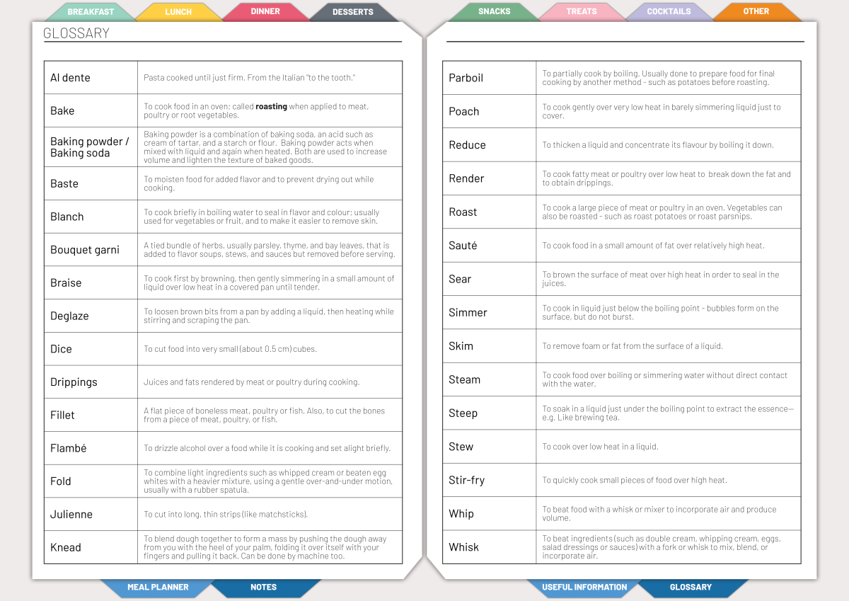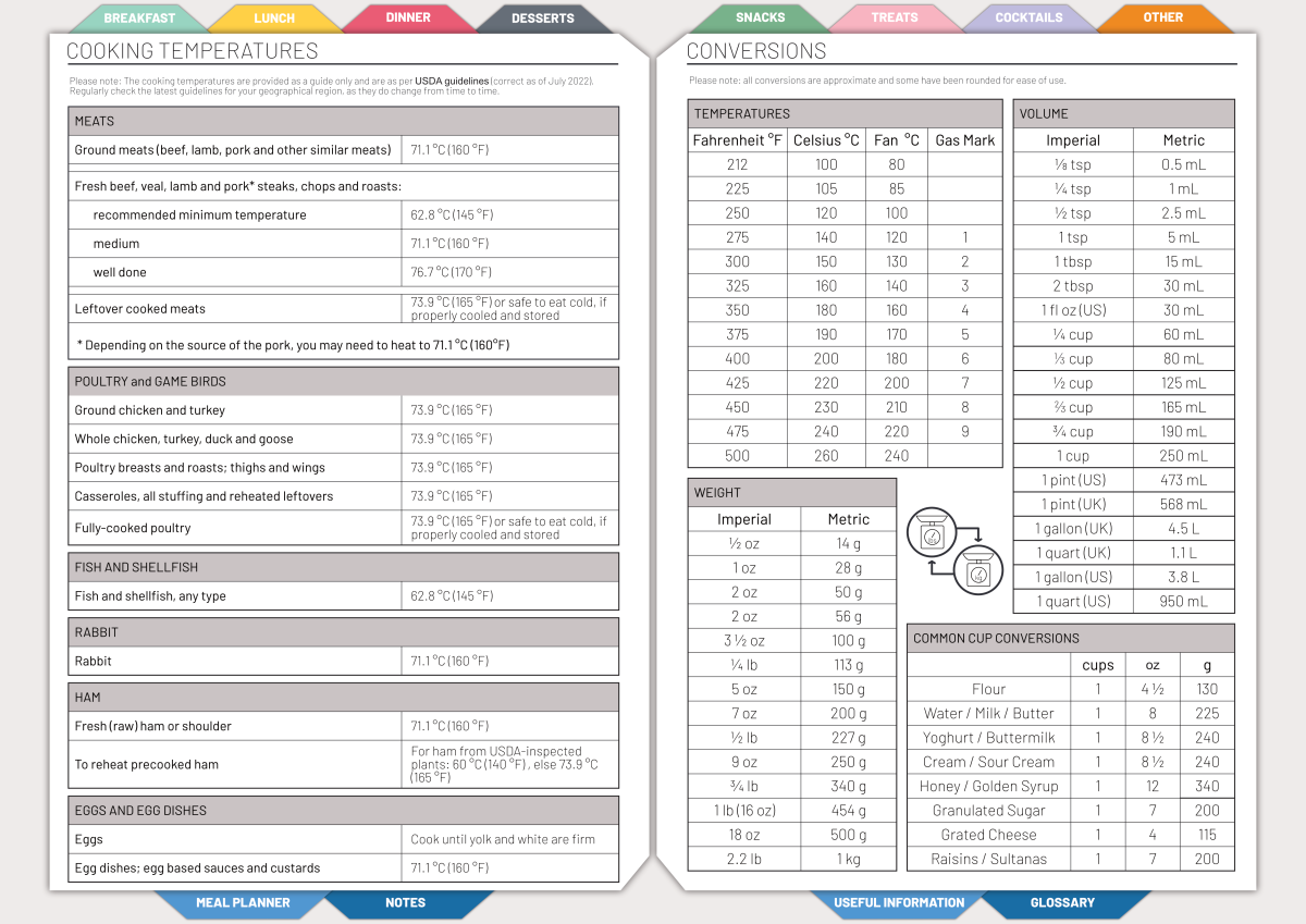 - Pages for breakfast, lunch, dinner, desserts, snacks, treats, and cocktail recipes!