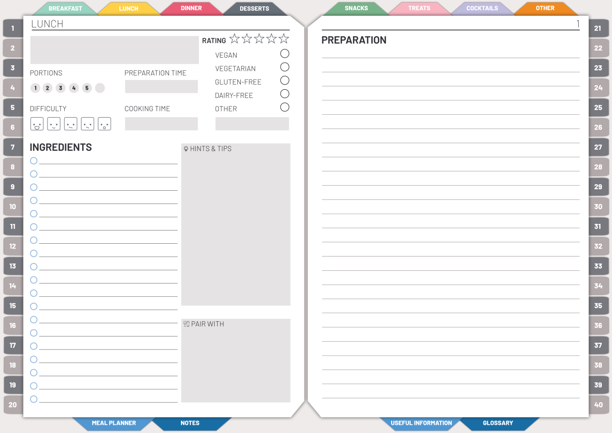 This is our digital recipe journal. Packed with over 400 pages for all your recipes. It includes the following: