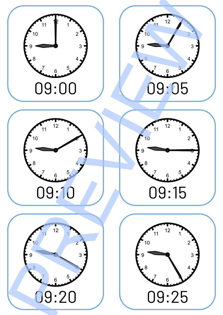 It includes analogue and digital clocks for every 5 minutes from 8:00am to 5:00pm. The digital clocks are fully editable and the analogue clocks are embedded as PNGs so you can reuse them elsewhere – ideal for teaching telling the time to the nearest 5 minutes.